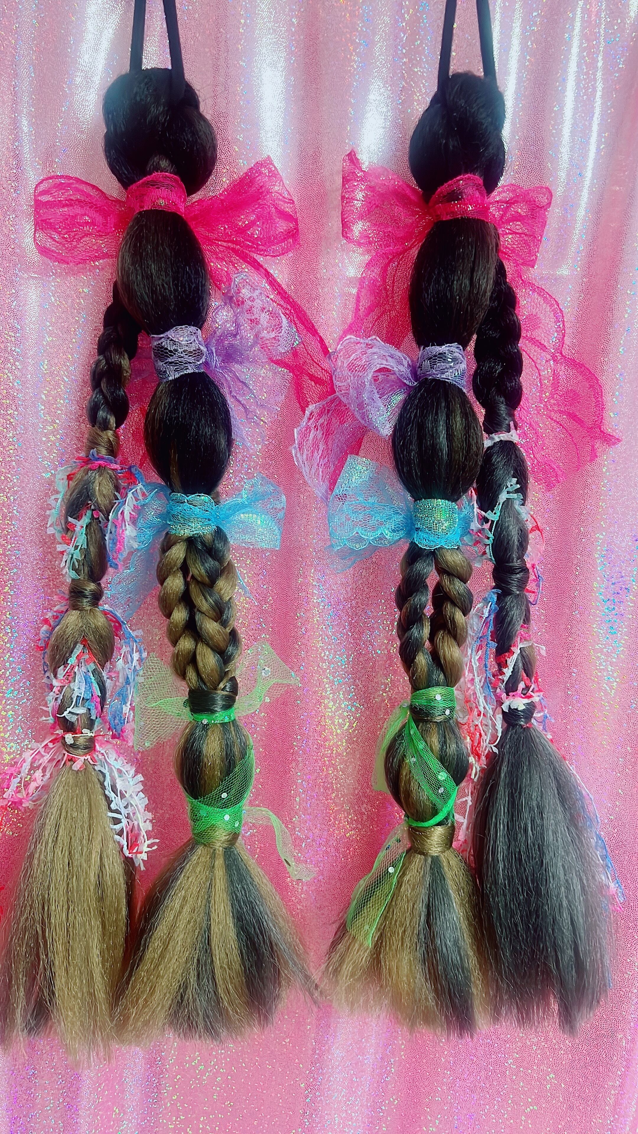 簡単に"へんしん"できちゃうヘアゴムでブラックグラデーションにカラフルなリボンのデザインになります!